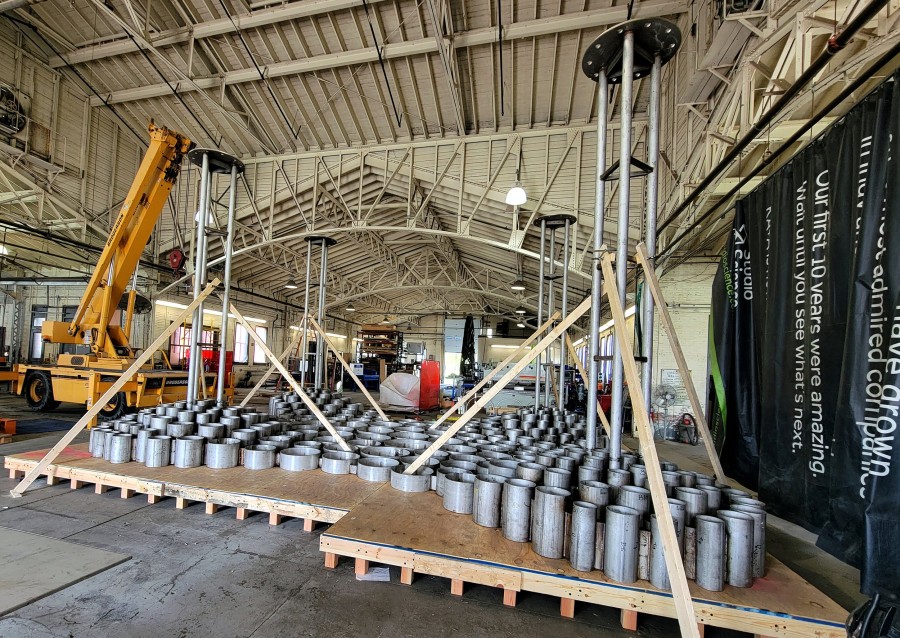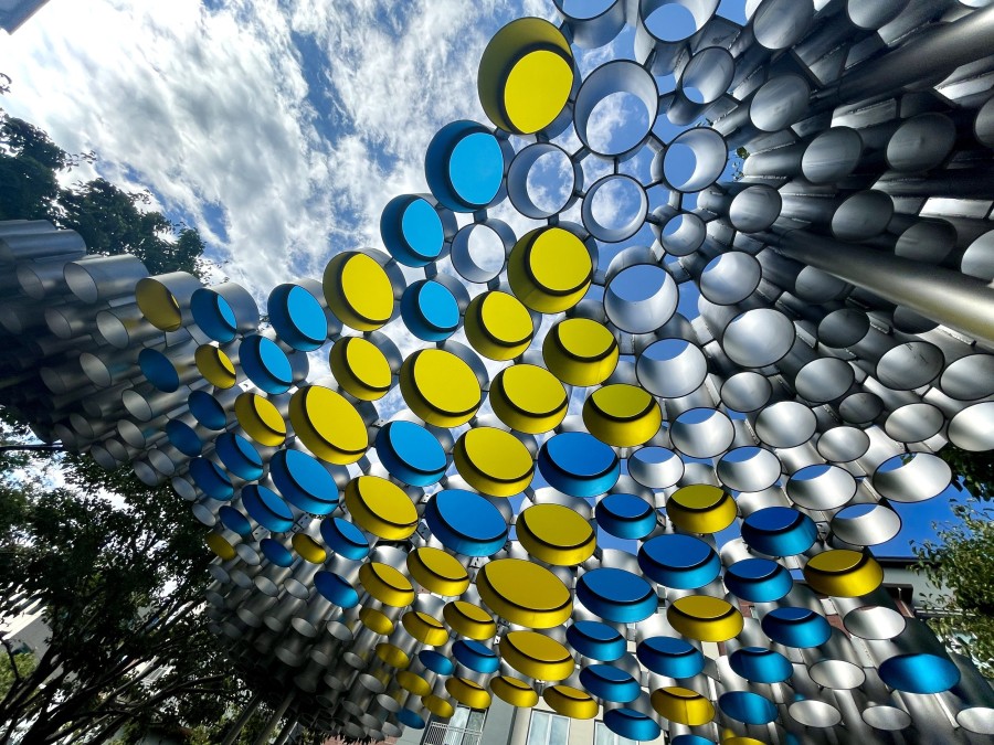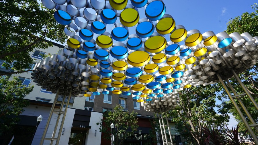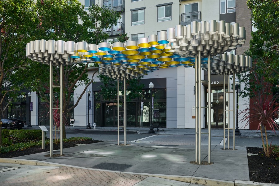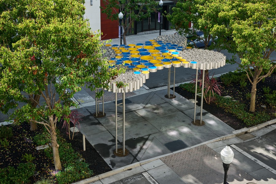 One Thousand Suns is a shaded canopy that CHORUS commissioned artist-architect duo FutureForms (Nataly Gattegno and Jason Kelly Johnson) to create for a previously overexposed gathering point. FutureForms chose to harness the sunlight by diffracting it through tinted apertures that cast dynamic shadows upon the ground and those gathering beneath. The translucent blue and yellow panels meld together into greenish pools of light, connecting its aura to the surrounding trees and landscaping.