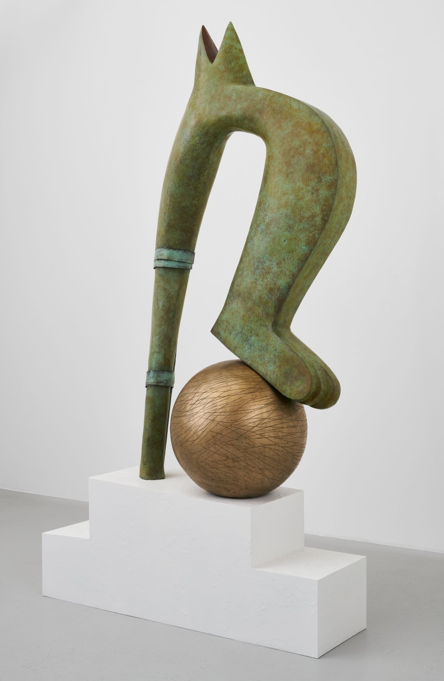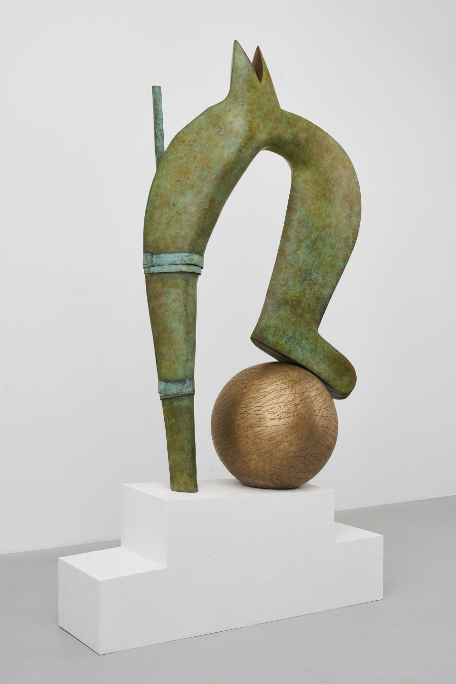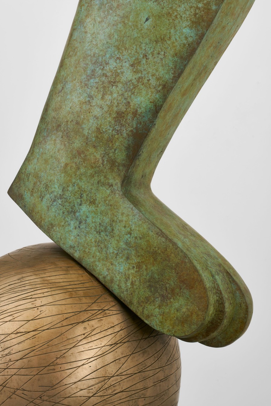 In Dropping the Ball, a cartoonish foot is perched atop a bronze orb that is polished and marked in order to appear as though it is spinning. The rounded leg arcs into a second, slimmer, limb that is supported by a crutch. The figure is elevated on an imposing yet irregular pedestal. Henrot plays with the ability of bodily gestures to convey a mood in the absence of language or facial expressions. Here, we see iconic symbols of power and support conflated and deflated with absurdity. Henrot’s hybrid figures—neither human, nor animal, nor plantlike in form—exist in a state of perpetual becoming. They always suggest the capacity to evolve, and seem to ease into their own metaphysical contradiction.