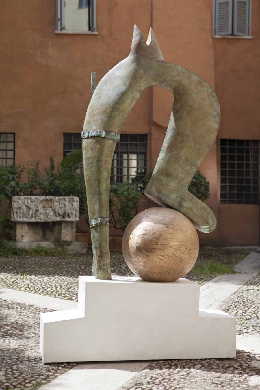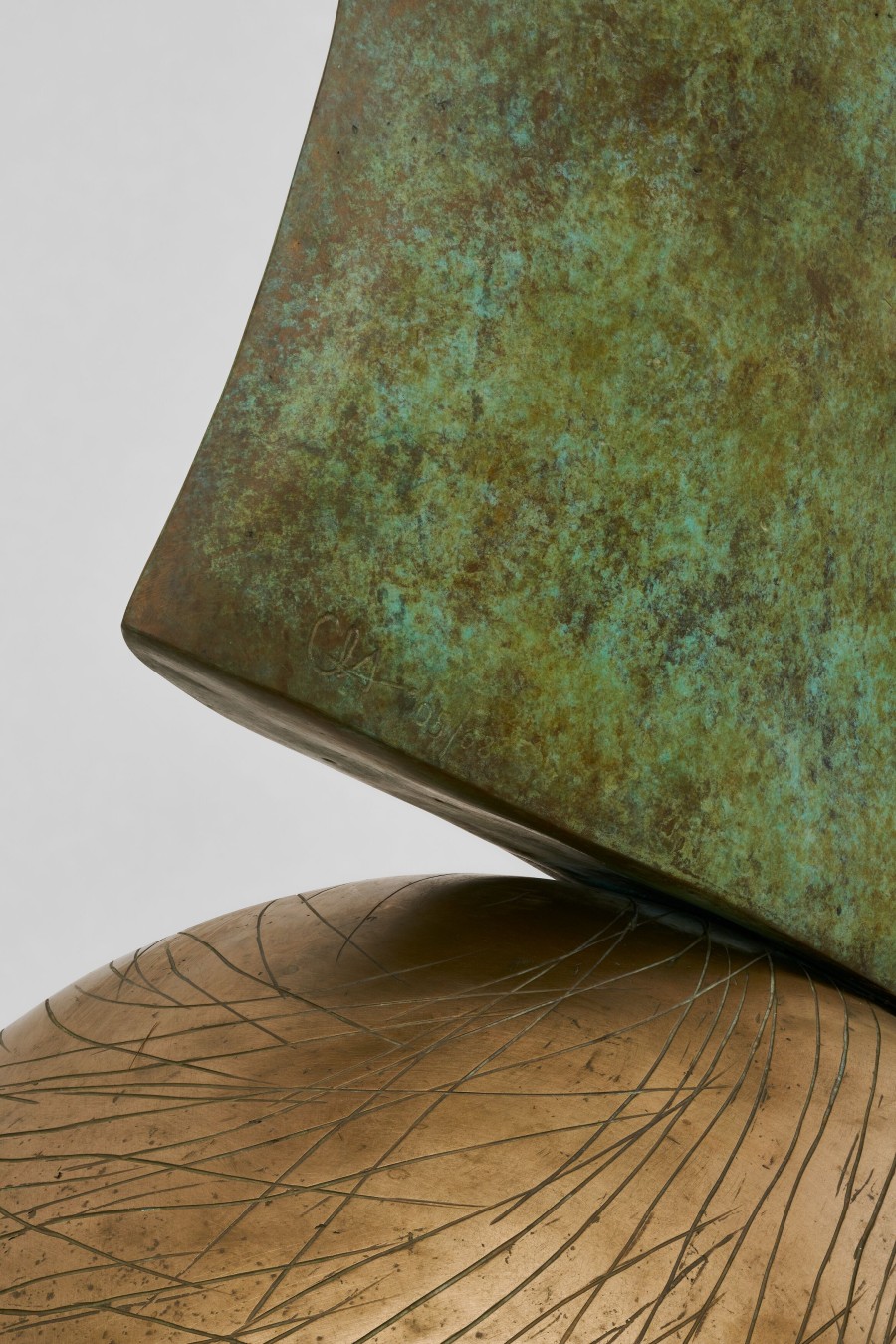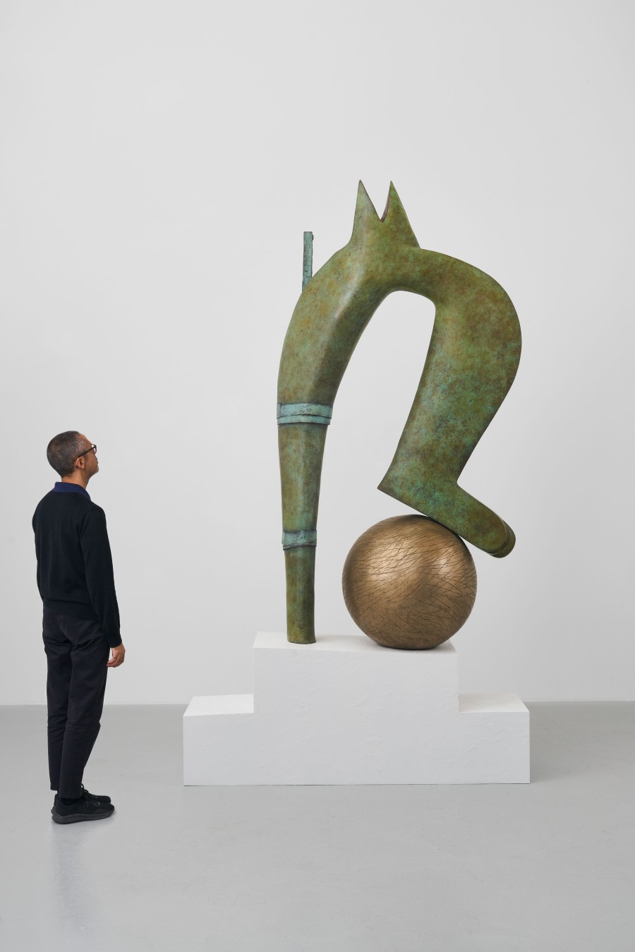 In Dropping the Ball, a cartoonish foot is perched atop a bronze orb that is polished and marked in order to appear as though it is spinning. The rounded leg arcs into a second, slimmer, limb that is supported by a crutch. The figure is elevated on an imposing yet irregular pedestal. Henrot plays with the ability of bodily gestures to convey a mood in the absence of language or facial expressions. Here, we see iconic symbols of power and support conflated and deflated with absurdity. Henrot’s hybrid figures—neither human, nor animal, nor plantlike in form—exist in a state of perpetual becoming. They always suggest the capacity to evolve, and seem to ease into their own metaphysical contradiction.