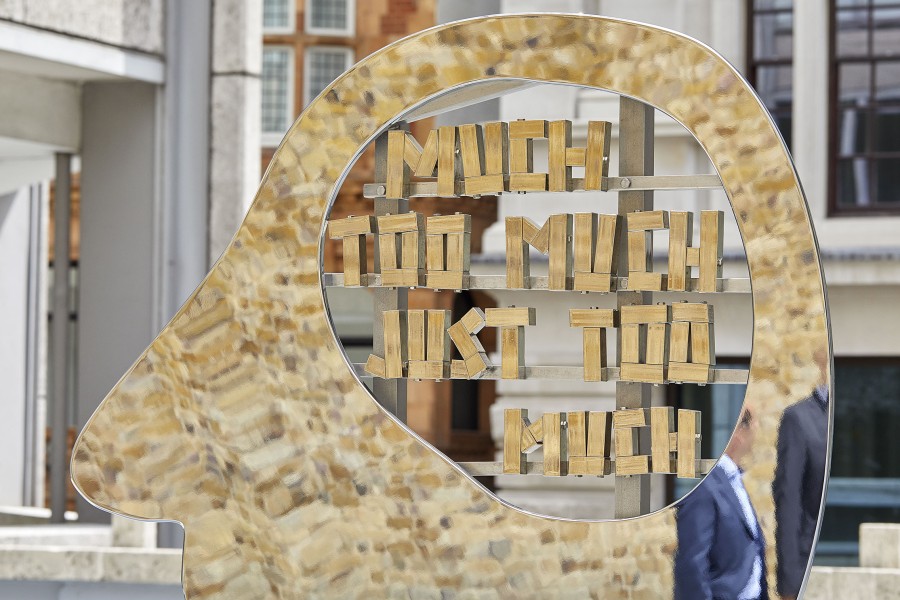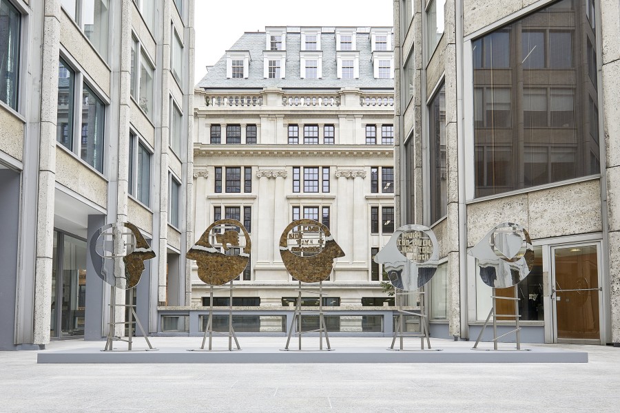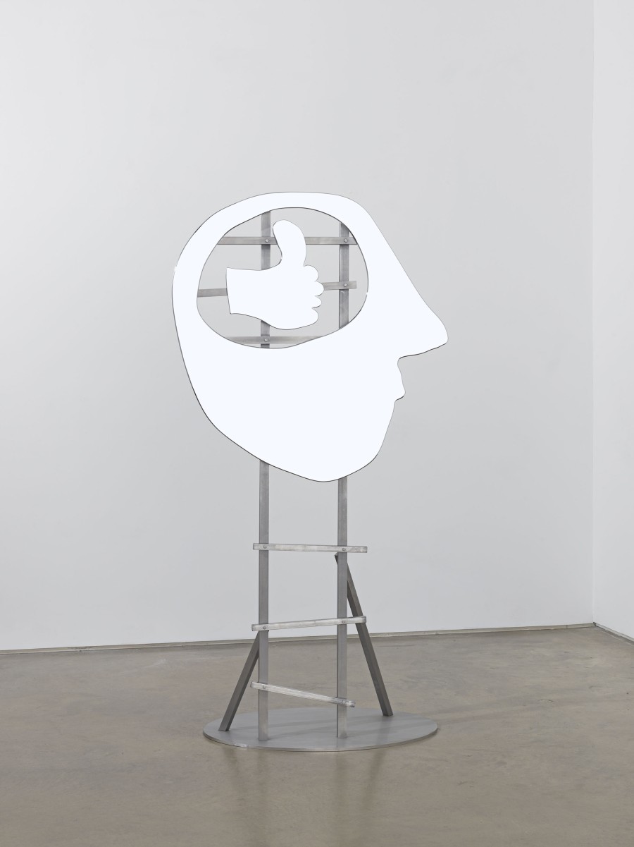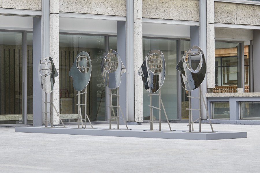 'Heads' is a series by Swiss artist Olaf Breuning that brings together five individual works, each featuring a cartoonish face in profile with a thought bubble in the center. Breuning playfully adopts the iconography and experience of popular culture as a commentary on a generation that is intertwined with the internet. In approaching this series of sculptures he asks, 'How do we react to the avalanche of stimuli and information that the technological world floods us with?' He seeks to test the limits of humor and aesthetics to create moments of pausing and pondering.