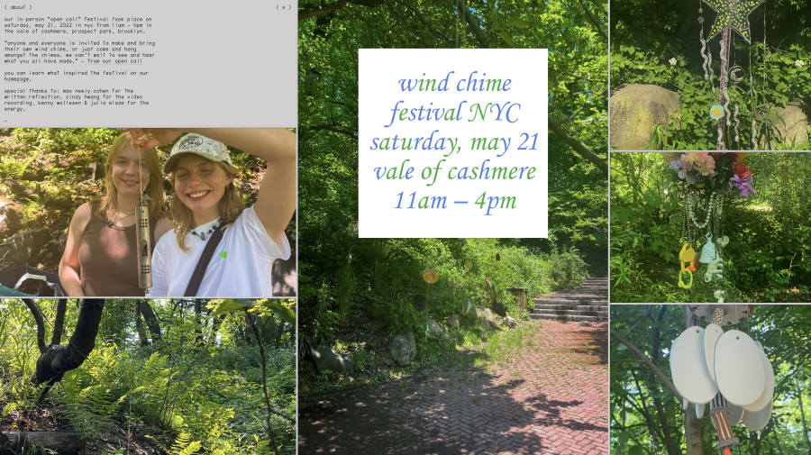 CHORUS and Laurel Schwulst organized a chime festival to accompany the digital public exhibition, The World Wide Wind Chime Festival. This pop-up public art event took place on Saturday, May 21, 2022 in NYC from 11am – 4pm in the Vale of Cashmere, Prospect Park, Brooklyn, NY.